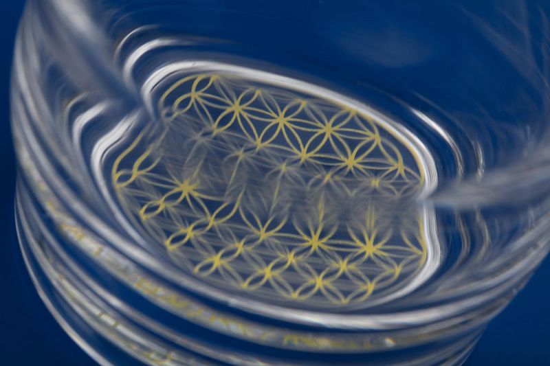 Bei der Gold-Variante ist die Blume des Lebens aus 23,8 Karat Gold im Boden eingebrannt.